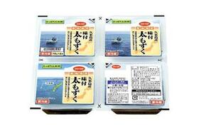 原材料:もずく(沖縄県久米島)、しょうゆ(大豆を含む)、米酢、砂糖、かつおエキス(小麦を含む)、魚介エキス、はちみつ、酵母エキス、こんぶエキス、しいたけエキス/酸味料