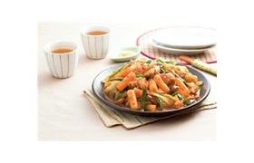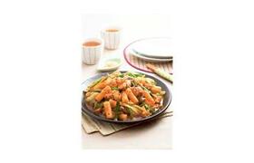 鶏肉と野菜を甘辛く仕上げた韓国料理の”ダッカルビ”を手軽に!トッポギのモチモチ食感と本格キムチの味わいがクセになる一品です。