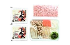 原材料:鶏肉、しめじ、玉ねぎ、もやし、えのき、人参、青ねぎ 添付【もめん豆腐】丸大豆(カナダ又はアメリカ)(分別生産流通管理済み)/凝固剤(塩化マグネシウム)【つゆ(希釈用)】しょうゆ(国内製造)、食塩、砂糖、削りぶし(かつお、うるめ)、醗酵調味料、にぼし、酵母エキス、昆布/調味料(アミノ酸等)、(一部に小麦を含む)【馬鈴しょ精製でん粉】馬鈴しょ 原料原産地:もめん豆腐(国内製造)