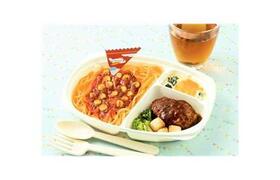 原材料:ナポリタンスパゲッティ【スパゲッティ(デュラム小麦のセモリナ)(国内製造)、野菜(とうもろこし、たまねぎ)、トマトケチャップ、トマトペースト、植物油脂、砂糖、オニオンペースト、フルーツチャツネ、野菜ソテーペースト、食塩、りんごペースト、ベーコン風味調味料、デミグラス風ソース、にんにくペースト、香辛料】、デミハンバーグ・ポテト+ブロッコリー【ハンバーグ(食肉(鶏肉、豚肉、牛肉)、たまねぎ、牛アキレス、植物油脂、粒状植物性たん白、つなぎ(パン粉、粉末状植物性たん白、乾燥卵白)、豚脂、ぶどう糖、砂糖、食塩、しょうゆ、牛脂、発酵調味料、香辛料、米発酵調味料、ワイン、ペースト状混合調味料)、フライドポテト、ブロッコリー、トマト・ピューレーづけ、乳等を主要原料とする食品、調味野菜ソテー